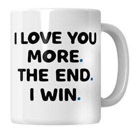 Die I Love You More The End I Win Tasse ist das perfekte romantische Geschenk für deine Frau, deinen Ehemann, Freund oder Freundin. Mit der liebevollen Aufschrift „I love you more, in the end I win“ zeigt diese Tasse nicht nur deine Zuneigung, sondern auch deine Fürsorge. Stelle dir vor, wie dein Partner die Box öffnet und erkennt, dass dies ein durchdachtes und einzigartiges Geschenk ist, das sich von langweiligen und generischen Präsenten abhebt.