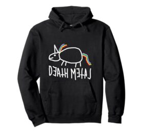 Entdecke den Death Metal Einhorn Regenbogen Unicorn Fun Pullover Hoodie, der perfekt für Metalheads und Headbanger ist. Mit einem humorvollen Design kombiniert dieser Hoodie die Welt des Death Metal mit dem verspielten Charme eines Regenbogen-Einhorns. Er ist ideal für alle, die sowohl die Härte des Rock als auch die Farbenfreude der LGBTQ-Community schätzen.